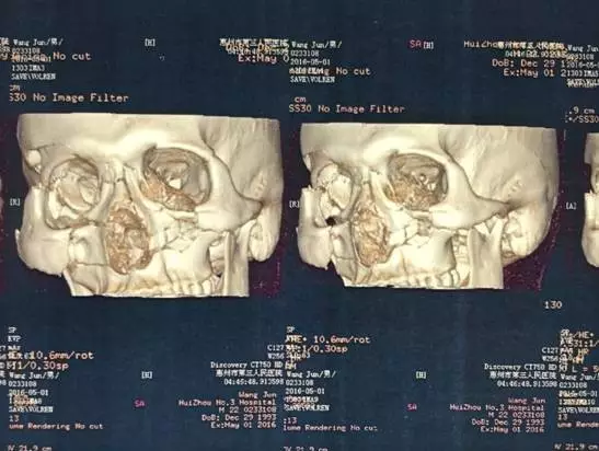 患者王某,因车祸致头颌面部疼痛出血1小时入院,经三维CT重建示:上颌骨lefortⅢ骨折,双侧颧骨复合体粉碎性骨折等。