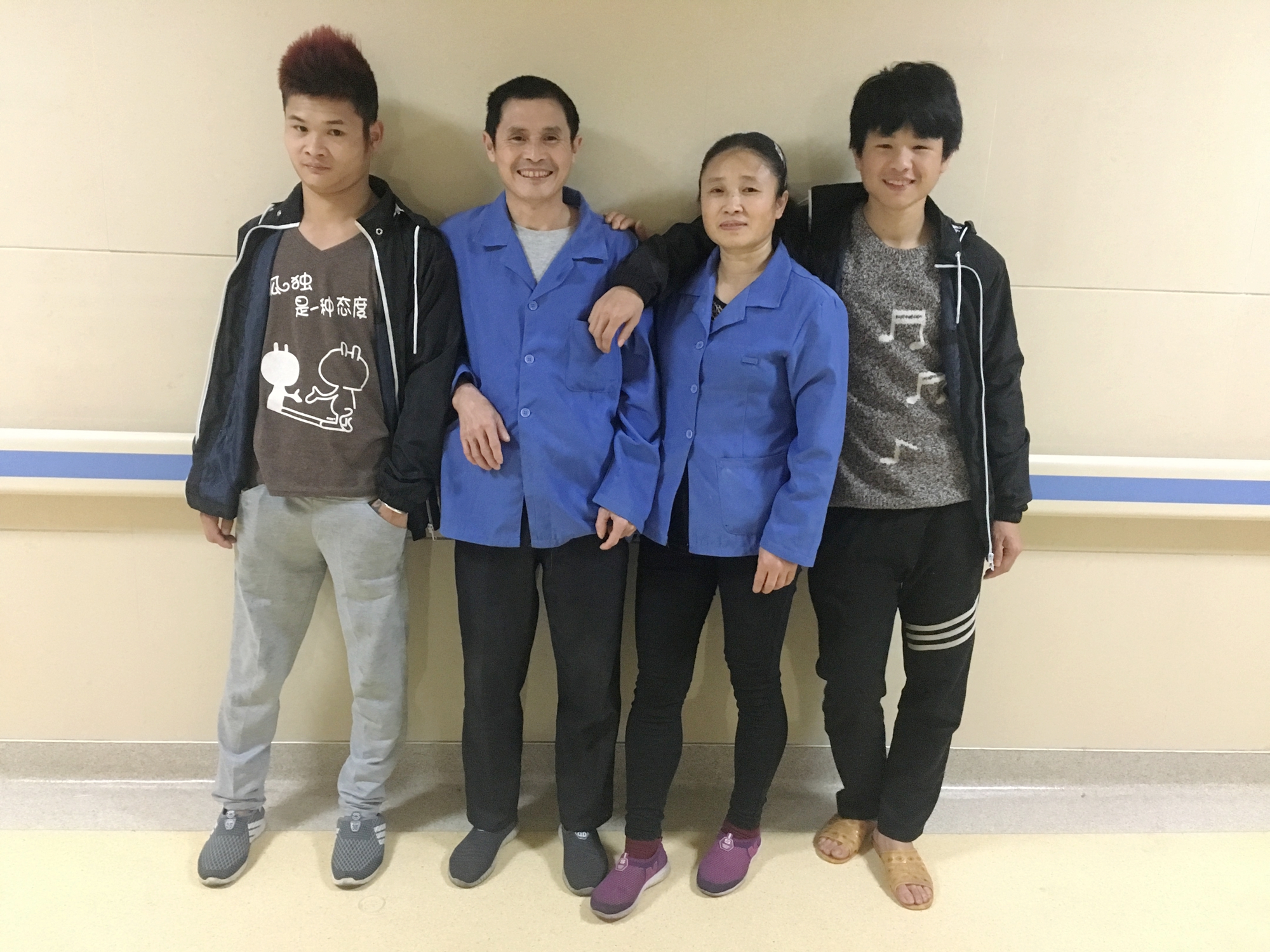 不过今年还是有些不一样,腾阿姨有两个孝顺懂事的儿子,一个在读高中,一个在读技术学校。春节里的一天,他们不远千里,长途跋涉,从老家跑到惠州找妈妈了。他们一家四口团聚了,团聚的地方不是湖南老家,也不是在旅游景区,而是在医院,在病房!