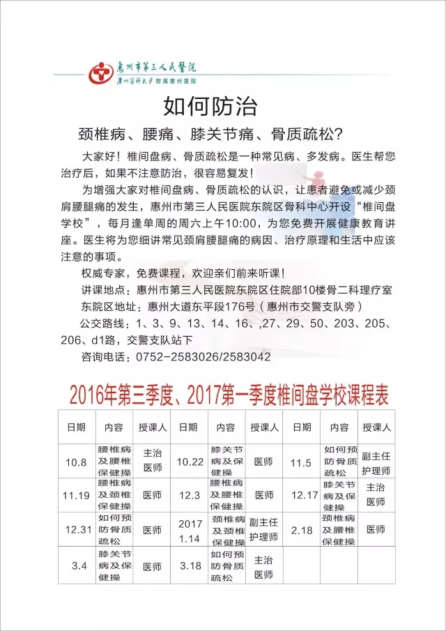 然而,为了更好的满足广大群众对此类疾病的了解和需要,惠州市第三人民医院颈肩腰腿痛开展了惠州市第一个椎间盘学校,以授课的方式每半月举行一次,从医院走进社区。深受得大家的喜爱,近段时间来,颈肩腰腿痛科正式开通了微信公众号,开设了特色医疗、健康教育等专题栏目,指在通过科学宣教和在线答疑,帮助大众了解颈肩腰腿痛及日常保健相关知识,引导患者合理就诊,提高科室的大众美誉度和患者满意度。我们将通过这个平台发布颈椎病、腰椎间盘突出、膝关节炎、重度骨质疏松、肩周炎等健康知识,为了自己,为了家人,有兴趣有需要查阅的朋友们可以搜索颈肩腰腿痛科微信公众号:惠州疼痛关爱之家。或者扫一扫以下二维码,免费关注,里面的相关健康知识都是免费查看,这个平台只做骨科相关疾病的宣传及生活的提醒,希望对大家的生活有帮助。