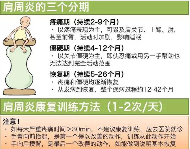 肩周炎的病程分为三期:即疼痛期、僵硬期、恢复期,疼痛期主要以疼痛为主,可累及肩关节、上臂、肘,甚至前臂,活动时加剧,影响睡眠。僵硬期主要是以关节僵硬为主,即使忍痛或用另一个手帮助也无法达到完全活动的范围,恢复期主要是以疼痛和僵硬均逐渐恢复,从发病到恢复,整个疾病过程约12-42个月。