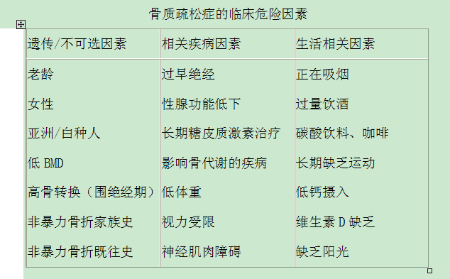 药物治疗适应证:已有骨质疏松症(T:≤-2.5)或已经发生过脆性骨折,或已有骨量减少(一2.5<T值<一1.0),并伴有骨质疏松症危险因素者(见上表)。常见药物有抗骨吸收和促骨形成两大类。