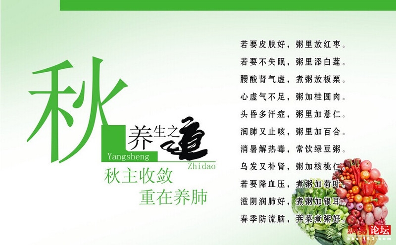 秋季要以清淡鲜嫩为主,多吃润肺去燥的食物(肺脏喜欢的食物:莲子、百合、藕、黑木耳、白木耳等;肺脏讨厌的食物:油炸食物,燥热食物如烤羊腿、各种小炒肉等)。