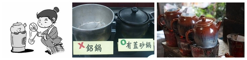 煎药的器皿一般以瓦罐、砂锅为好,搪瓷、不锈钢亦可,但忌用铝、铁器、铜器,防止这些金属物品与药物产生反应,影响药物疗效甚至对人体产生危害。李时珍曾说过:“凡煎药并忌铜铁器,宜用银器瓦罐”。现在一般通用的是有盖的陶瓷砂锅。