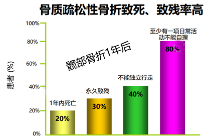 患骨质疏松症的老年人一旦发生跌倒,非常容易发生骨折。一旦骨折,后果将不堪设想。从下图可以看到,髋部骨折后1年内,死于各种合并症者达20%,存活者中约30%致残,,不能自己独立行走的也有40%,造成生活不能自理, 生命质量明显下降。