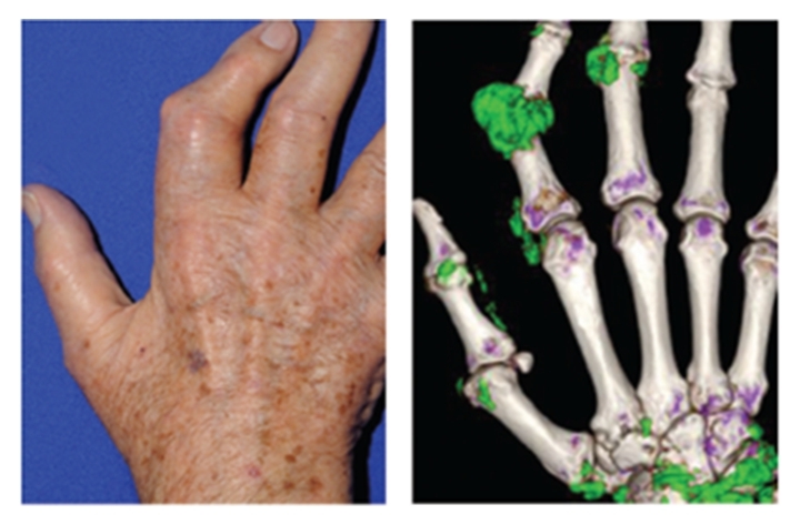 左边是普通人眼里痛风的关节。右边是双能CT下显示的图像,绿色的就是沉淀下来的尿酸。