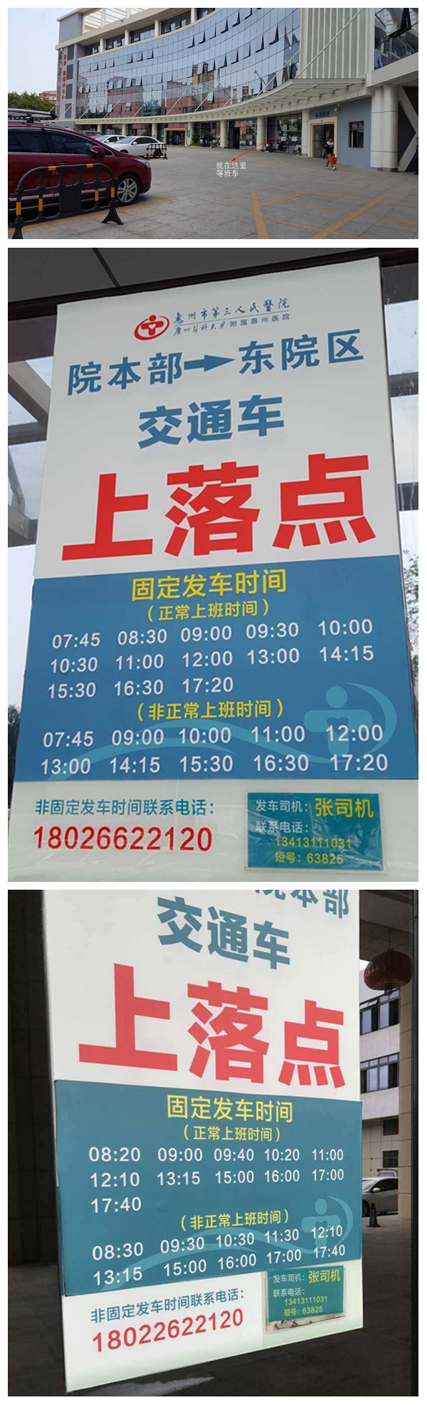 为了解决这个问题,医院层面特意采购了一辆20座的节能中巴车,每天专门负责院本部及东院区的往返工作。每天早上7:45,第一趟班车准时在院本部的门诊大楼大门口旁出发了,直抵东院区。随后,待从院本部去东院区的病友完成了基本的诊疗工作后,约8:30,在东院区门诊大楼大门口,从东院区回来院本部的班车准时出发,约10分钟左右的车程,就顺利抵达院本部了。就这样,每半个小时,院本部往东院区有一班车,半小时后,东院区再准时回来院本部,一直到下午17:40,门诊的医生都下班了,最后一班车的运营才结束。而且,班车接送全程免费的哦!