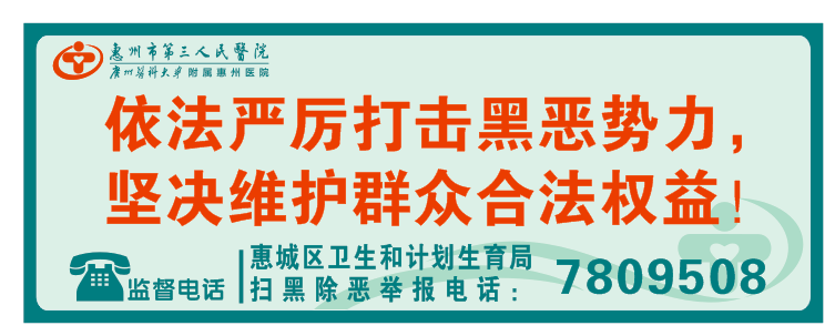 依法严厉打击黑恶势力,坚决维护人民群众合法权益。市民群众若发现涉黑涉恶违法犯罪线索,请拨打惠城区卫生和计划生育局扫黑除恶举报电话举报,举报电话:7809508