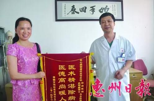 这天,来自湖南益阳农村的一名罕见的脊髓空洞患者谌女士就要出院了。她和妹妹一家人高兴得就像过节似的,对惠州市第三人民医院骨科医学中心主任、主任医师、惠州市著名脊柱外科专家武明鑫博士再三表示感谢,并向武主任赠送了一面寄托着全家人谢意的锦旗,上书“医术精湛除病,医德高尚暖人”。
