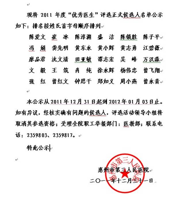 惠州市第三人民医院2011年度“优秀医生”评选正式侯选人公示