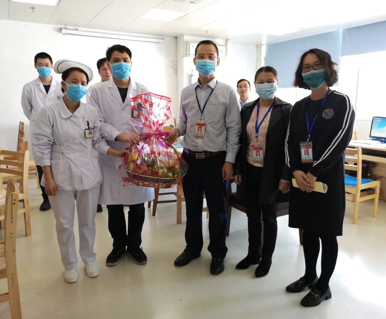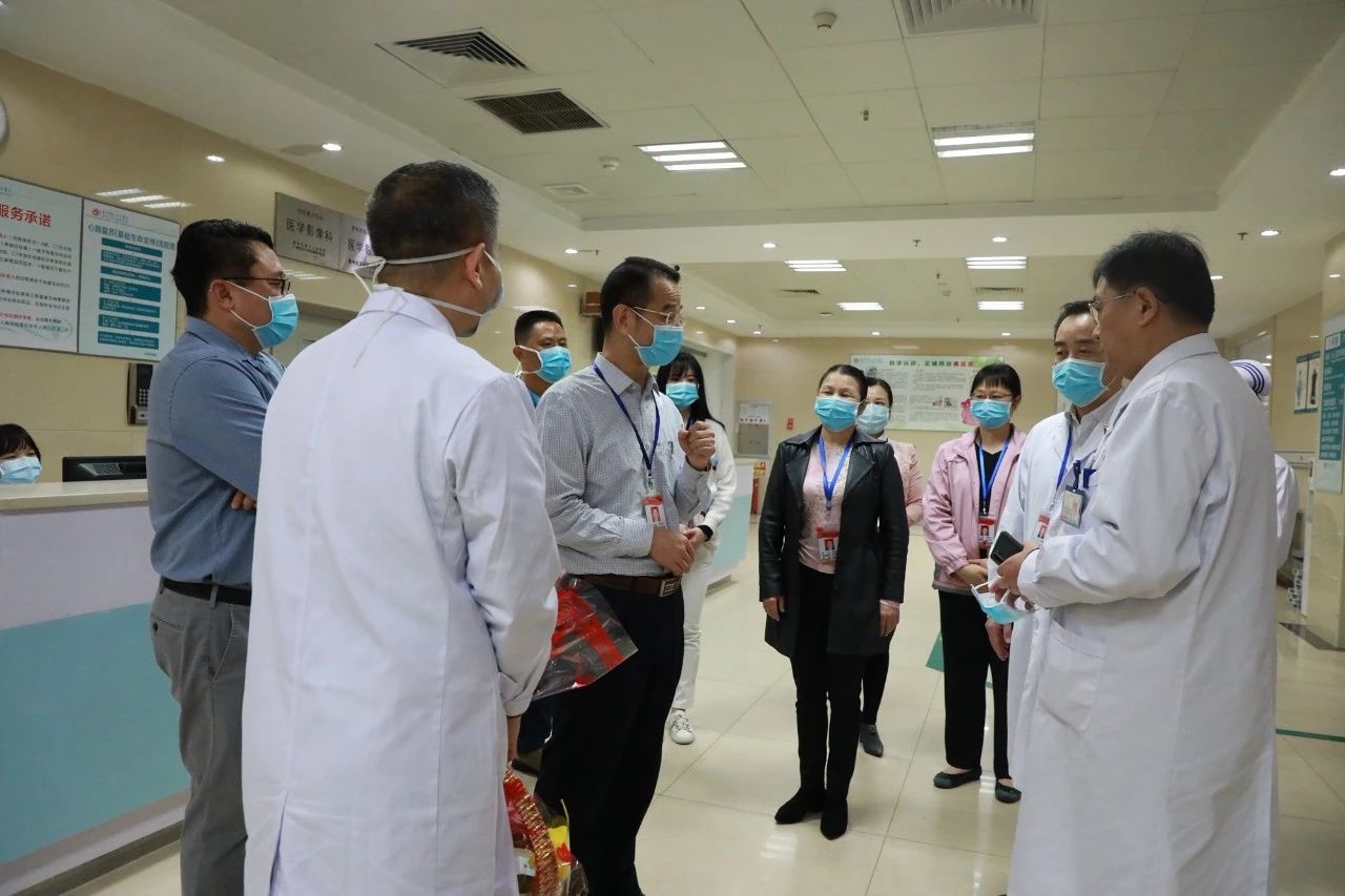 党委书记邓汉东(右三)、工会主席李淑兰(左二)、党委专职副书记杨燕媚(右二)等领导慰问ICU医护人员