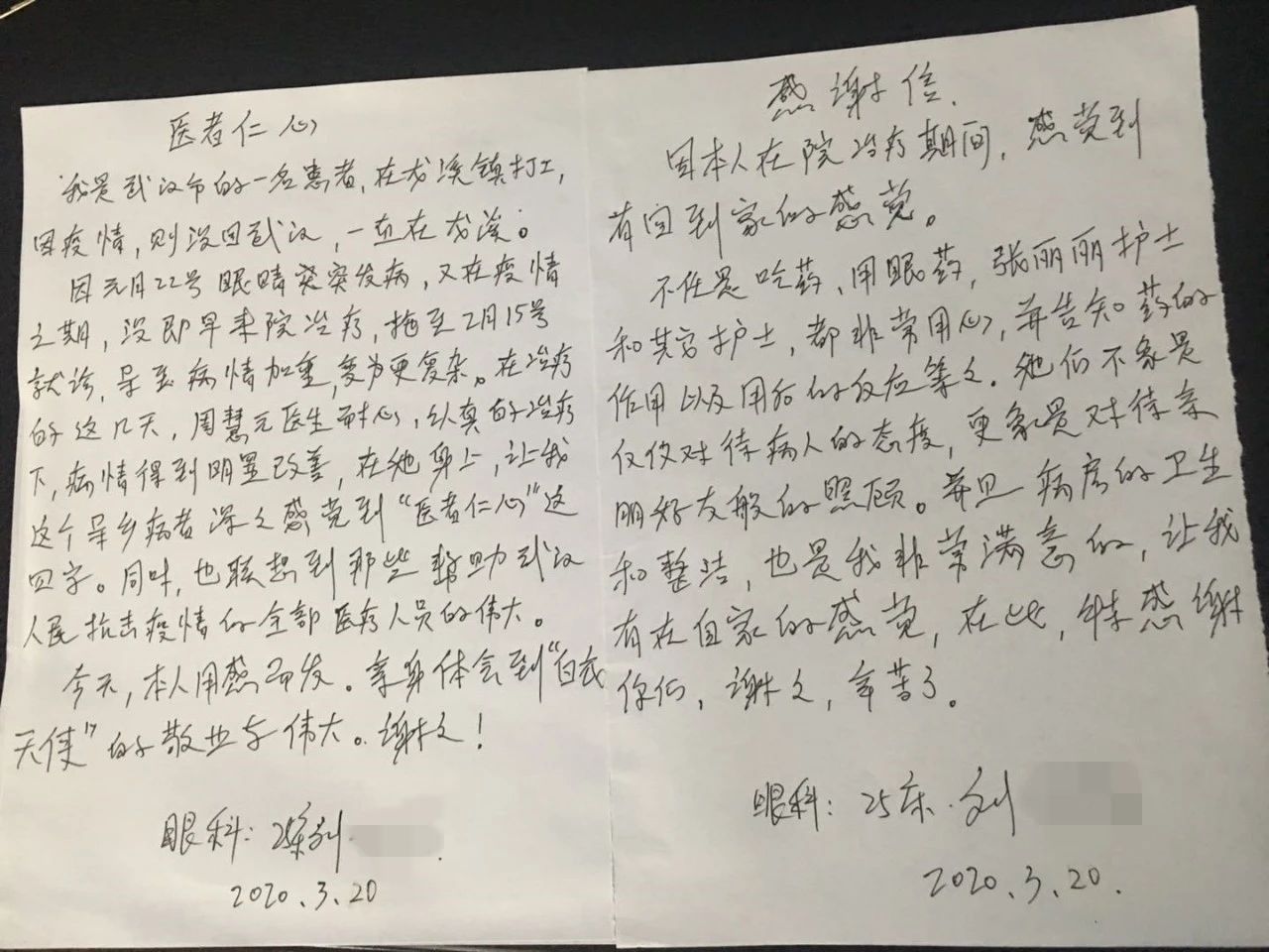 在新冠疫情这个特殊时期,很多人听到是武汉人都会戴着有色眼镜区别看待,但是眼科周慧兰医生及张丽丽护士等医护人员却像家人一样,给予他精心的治疗和悉心的护理,让他十分感动,病情也得到了明显改善。