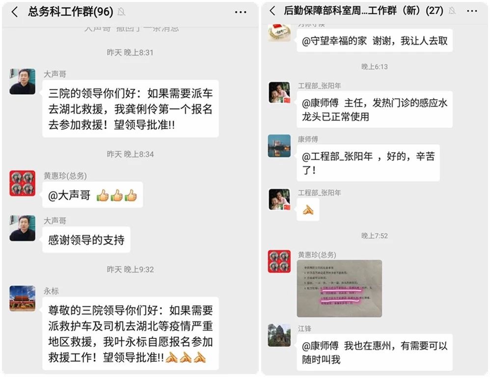 在新型冠状病毒感染的肺炎疫情防控工作中,这些可敬的员工在微信群里纷纷表达了”若有战、召即来、战必胜”的心声,踊跃报名参加防控工作。