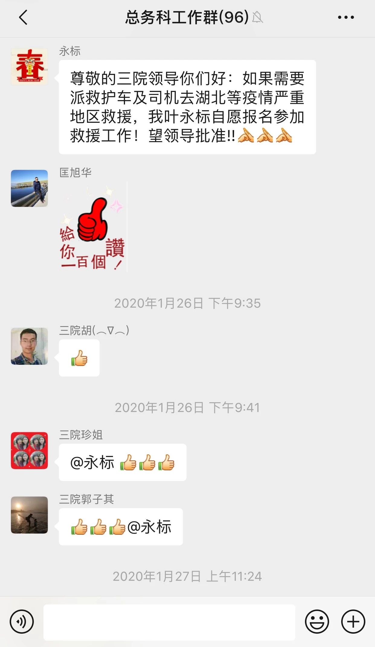 “如果需要派救护车及司机去湖北等疫情严重地区救援,我自愿报名参加救援工作!望领导批准!!”