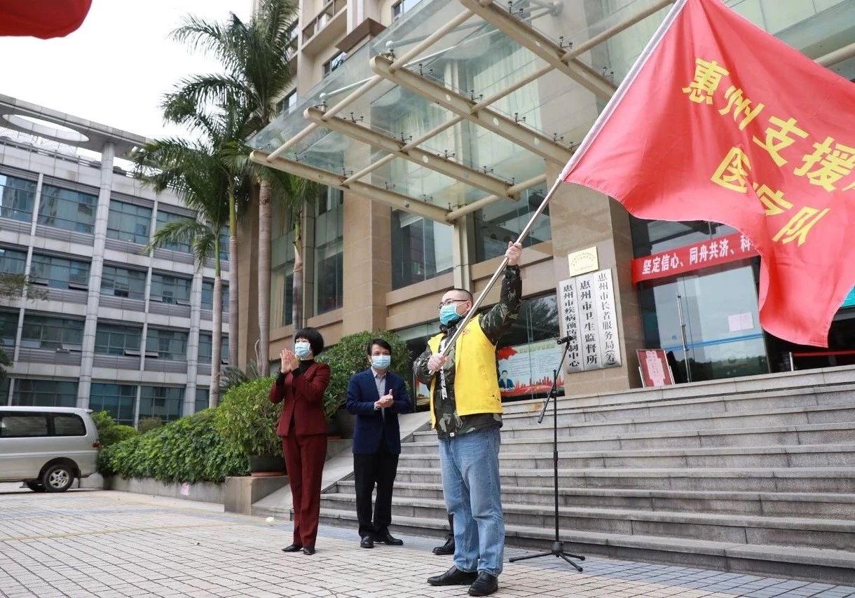 2020年2月9日上午10时30分,惠州市首批赴湖北援助医疗队出征仪式在惠州市卫生健康局举行,惠州市第三人民医院徐永辉同志代表15名医疗队员,从惠州市副市长陈高燕手中接过授旗,庄重宣誓后立即出发驰援湖北。惠州市卫生健康局党组书记、局长刘庆荣,惠城区委书记刘光滨等参加出征仪式。