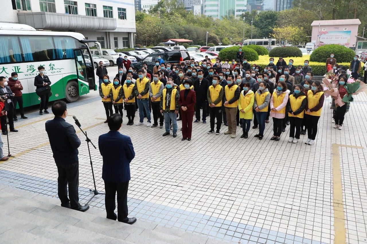 9日一早,惠州三院在门诊广场白求恩雕像前举行了简短的出征仪式,医院党委书记邓汉东等党政班子成员和队员科室同事一起为队员们壮行,鼓劲声和祝福声响彻广场。