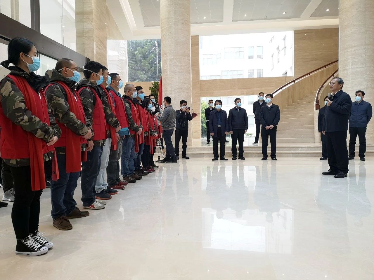 2020年2月11日上午10时30分,惠州市第二批支援湖北医疗队出征仪式在惠州市行政中心举行。惠州市委书记、市人大常委会主任、市防控工作领导小组组长李贻伟,惠州市委副书记、市长、市防控工作领导小组常务副组长刘吉为医疗队送行并授旗。市领导刘小军、陈高燕等参加出征仪式。