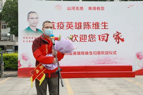惠城区人民政府副区长陈广文、惠州市卫健局副局长周丽、惠城区卫健局局长邹忠平,惠州三院党委书记邓汉东、院长马显力以及部分干部职工、已归惠的援鄂队员及部分员工代表,陈维生家属等100余人参与欢迎仪式。三院员工手持横幅,捧着鲜花,挥动小红旗,早早地守候在现场,夹道欢迎陈维生归来。