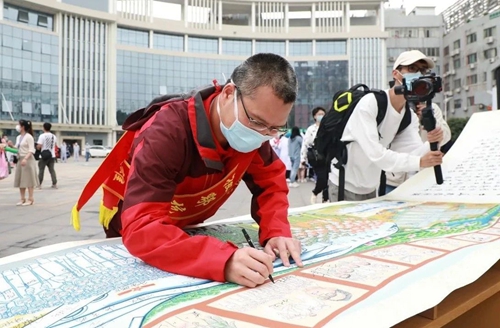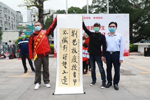 陈维生在一幅有惠州市援鄂医疗队75名队员签名的龙门农民画上签上自己的名字,至此该艺术作品76名队员签名圆满