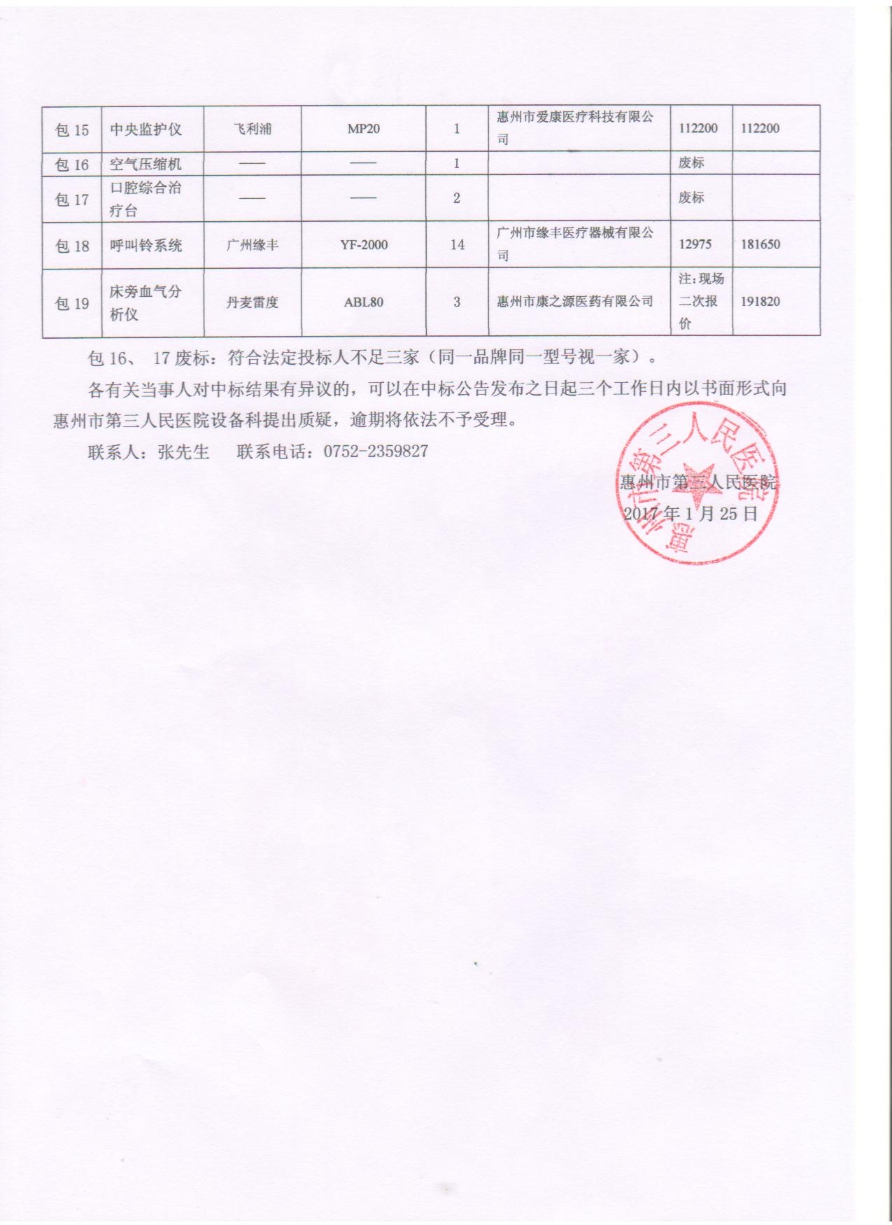 惠州市第三人民医院2016年第5批小型医疗设备院内招标中标公告