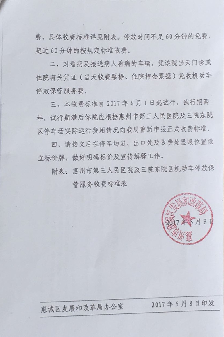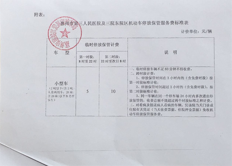 惠州市第三人民医院本部及东院区自2017年6月1日起试行对停放保管的车辆收取机动车停放保管服务费,具体收费标准详见下图。停放时间不足60分钟的免费,超过60分钟的按规定标准收费。对看病及接送病人看病的车辆,凭当天门诊或住院有关凭证(当天收费票据、住院押金票据)免收机动车停放保管服务费。