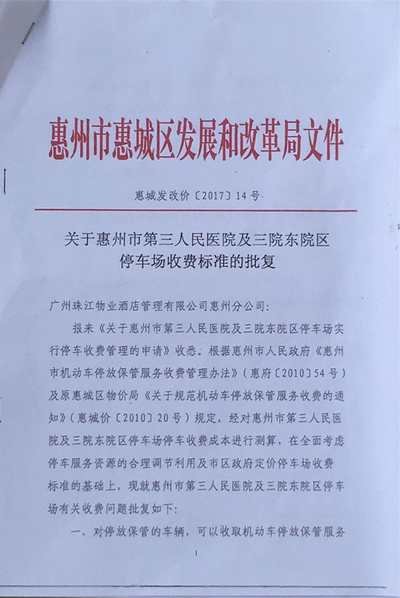 关于惠州市第三人民医院本院区及东院区停车场收费标准公告